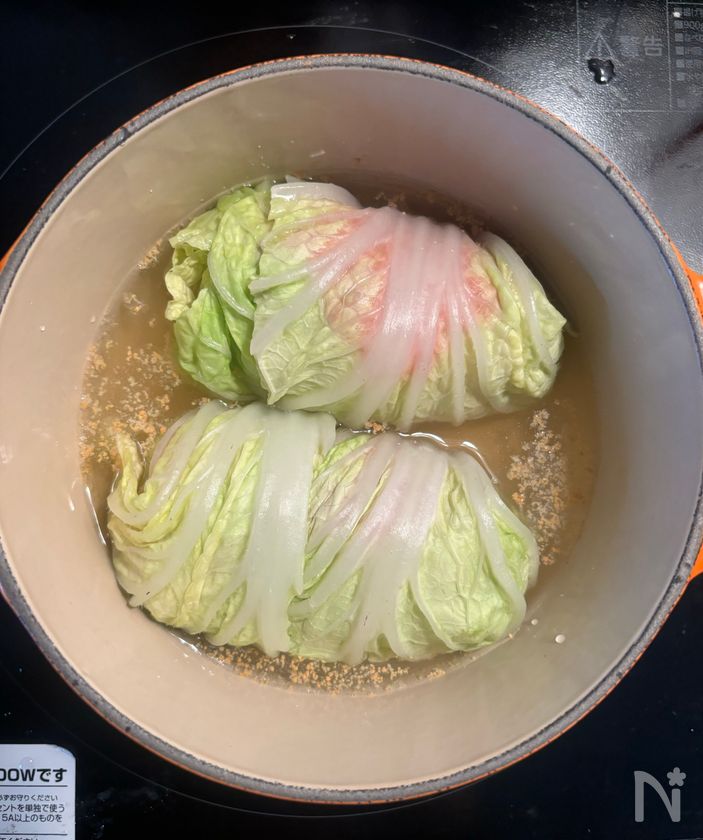 ・巻く時はしっかりときつめに巻くこと、ロール白菜がちょうどおさまるお鍋で煮込むと煮崩れしにくいです!