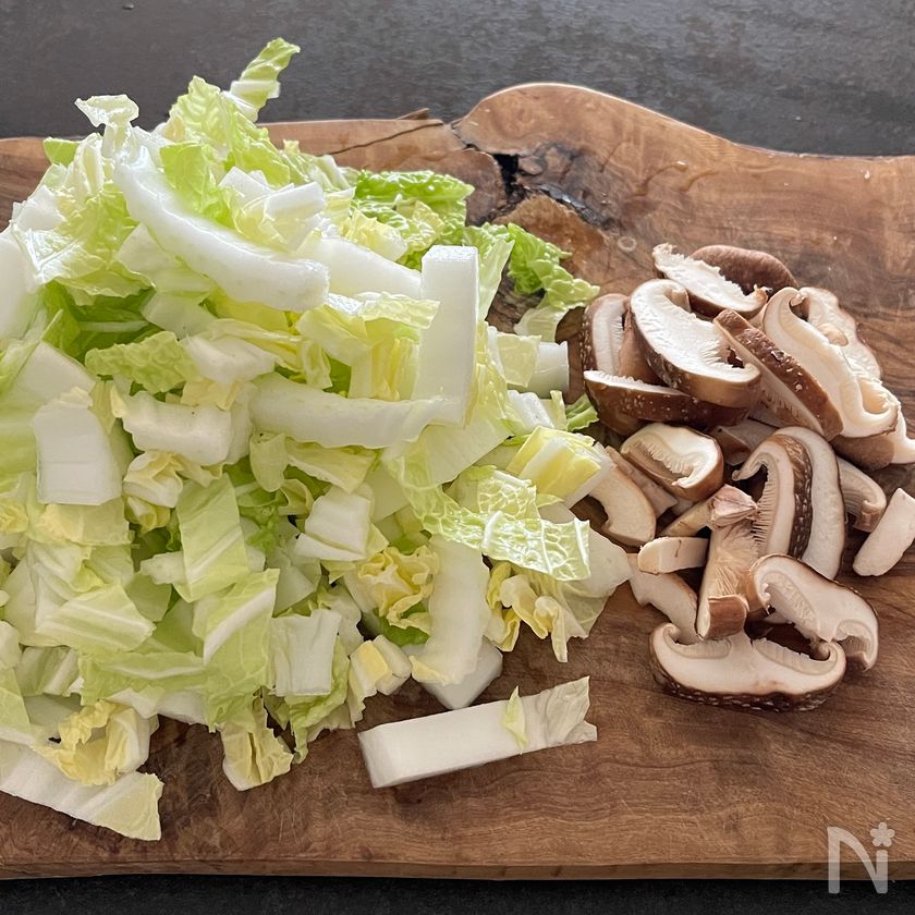 (1) 白菜は1cm幅、椎茸は石づきを落として薄切りにする。