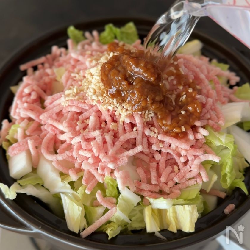 (2) 鍋に椎茸→白菜→豚ひき肉と重ねて入れ、【A】を加えたら蓋をして5分程煮込む。