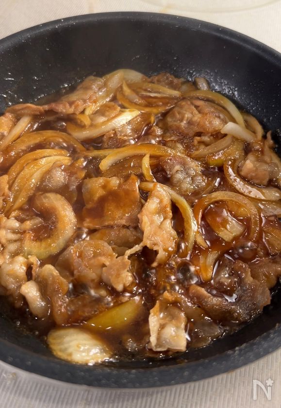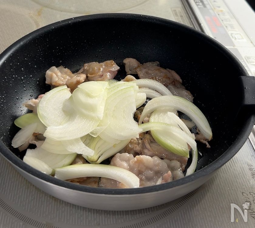 (2) 肉の色が変わったら、玉ねぎと【A】を入れる。