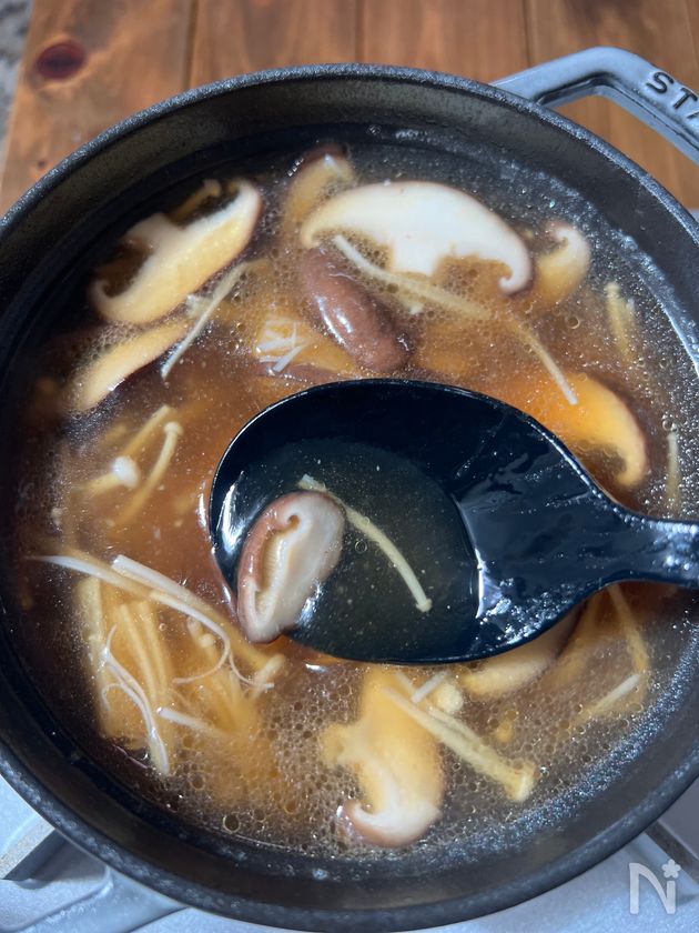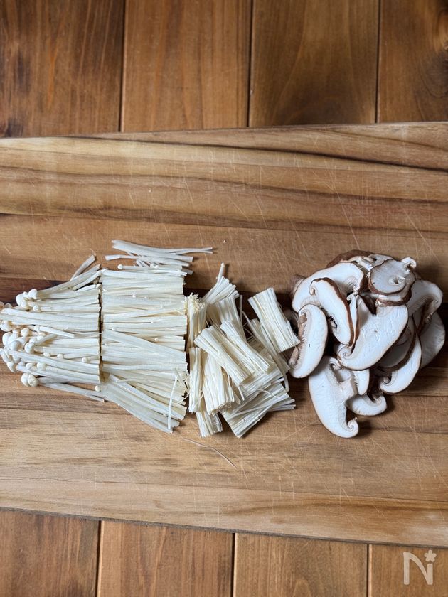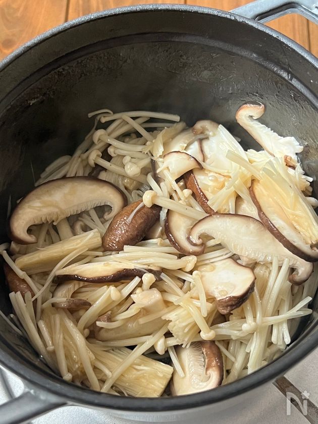 (1) フライパンにごま油をひき中火にかけたら、えのきとしいたけを入れ1分ほど炒める。