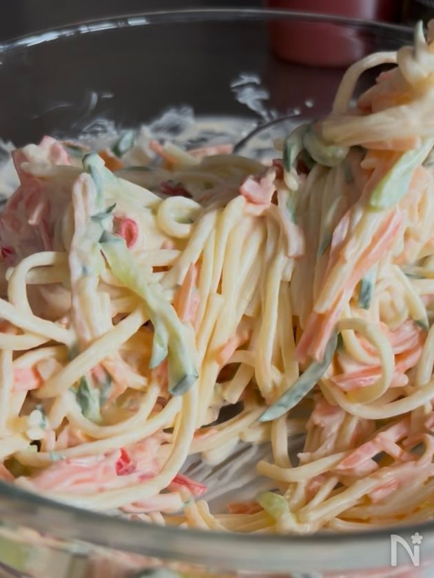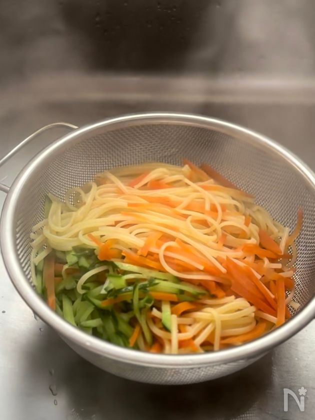 (1) 鍋に湯を沸かし、塩を入れる。沸騰したところに半分に折ったスパゲティを入れて茹でる。表記時間の3分前に人参、1分前にきゅうりを入れ、ザルにあけ冷ましておく。