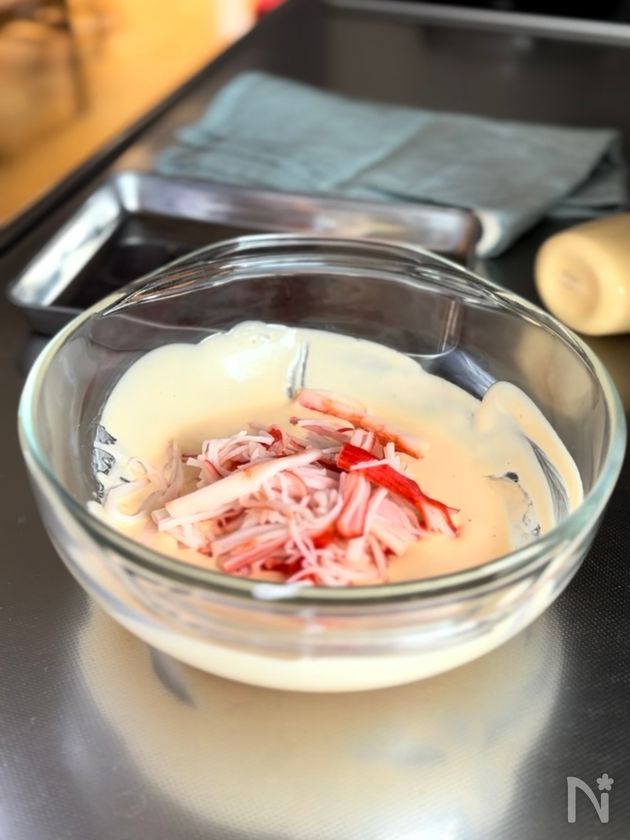 (2) ボウルに【A】のマヨネーズソースを混ぜ合わせ、ほぐしたカニカマを入れる。