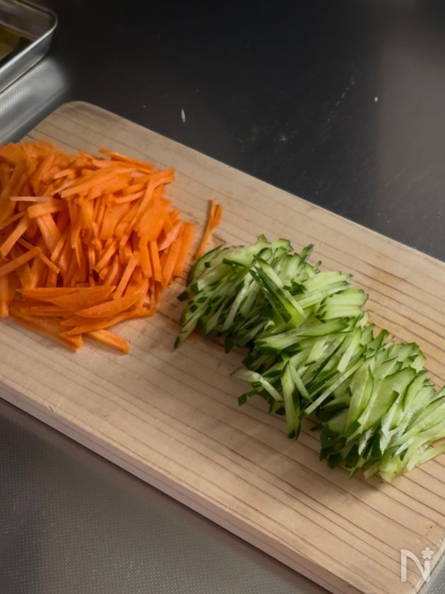 (下準備) 人参ときゅうりは千切りにしておく。