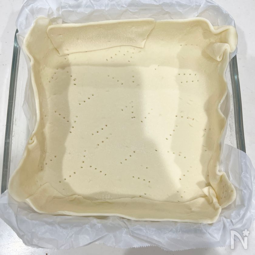 (3) 冷凍パイシートを綿棒で伸ばし、クッキングシートを引いた耐熱容器に敷く。フォークで穴をあける。