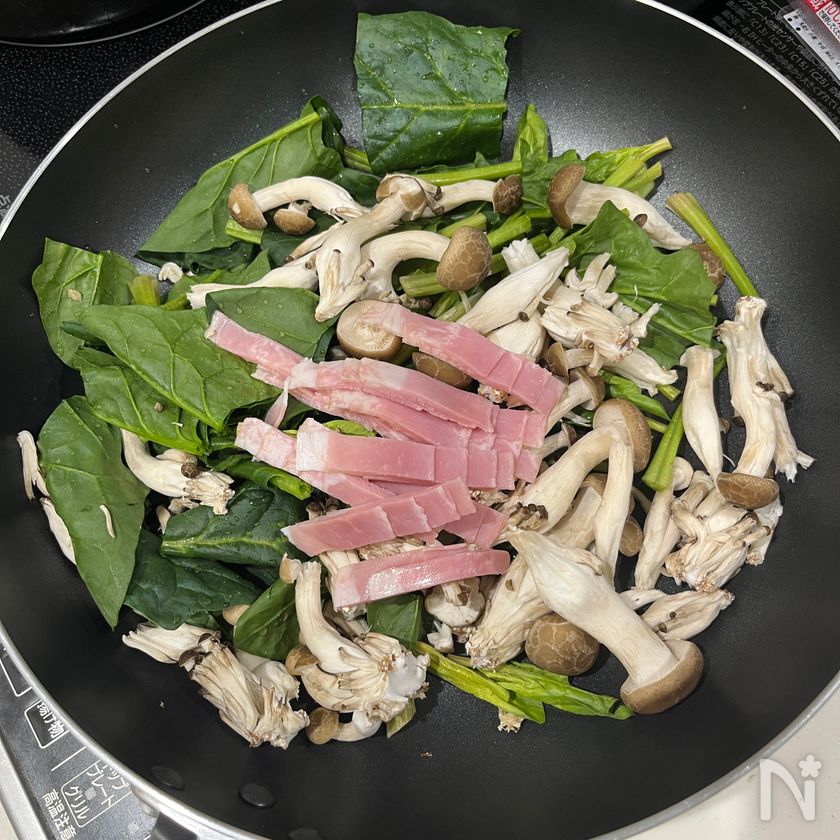 ほうれん草、ハーフベーコン、しめじを食べやすい大きさに切り、フライパンに入れ、弱~中火で3分ほど炒める。