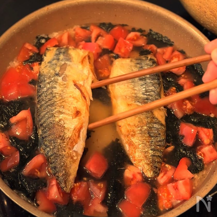 ちぎった焼き海苔(3枚分)、トマト、さばを乗せて蓋をして全体がしっかり沸騰するまで中火で加熱する。