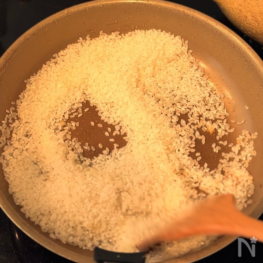(2) 同じフライパンに米を入れて油をさっと馴染ませる。