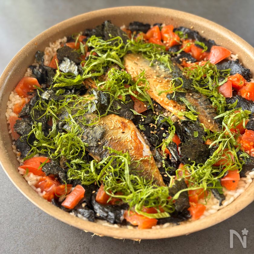 海苔香る♪【トマトと焼き鯖のパエリア風ごはん】