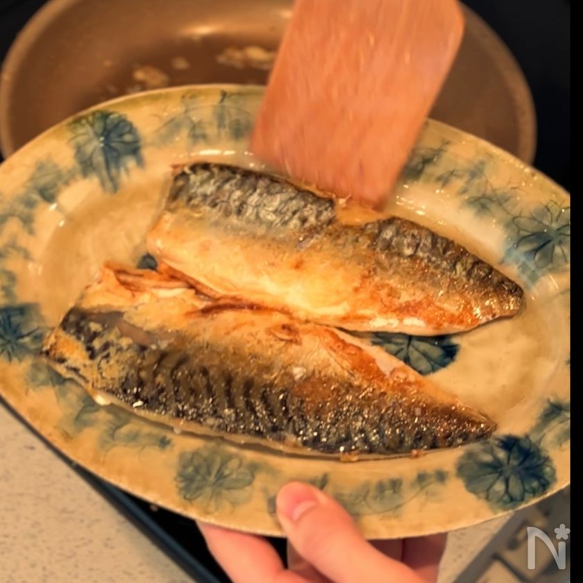 (1) フライパンにオリーブオイル、おろししょうが、さばを皮目から入れてこんがりするまで焼く。
