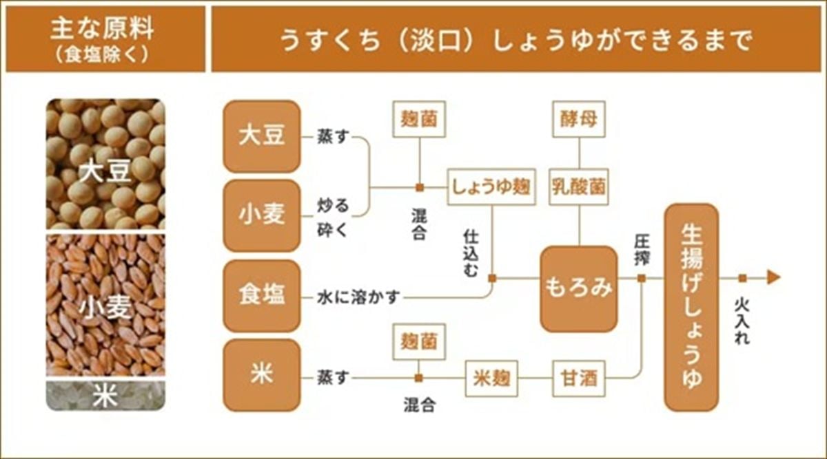 五味さん「『こいくち』は大豆・小麦・食塩をいったり、むしたりした後に、こうじ菌としょうゆ菌を加え『もろみ』を作ります。その後、もろみに酵母と乳酸菌が加わり、圧搾した『生揚げしょうゆ』を火入れして完成します。一方の『うすくち』は大豆・小麦・食塩に、米を加えます。『こいくち』の製法に、米の米こうじ、甘酒といった成分が加えて、作り上げます。お伝えした通り、味が異なっているのに加え、製法も違うというわけです」