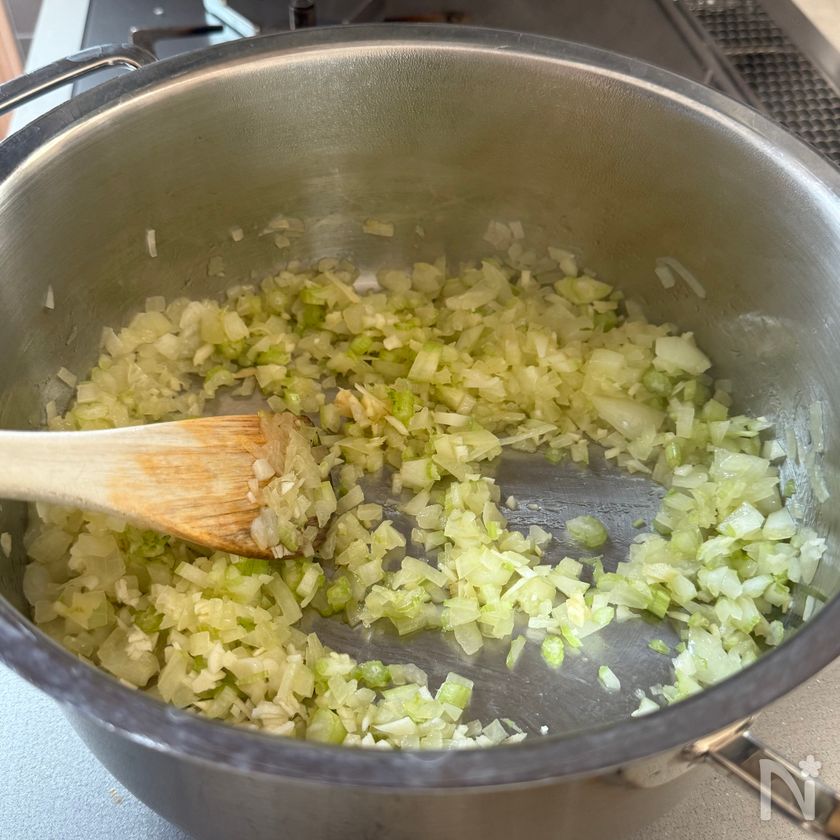 セロリ、にんにく、しょうがを加えてさらに炒め、香りを立たせる。