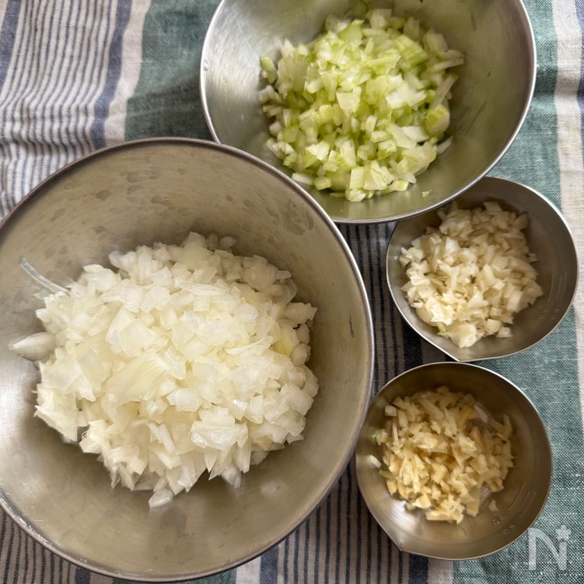 (1) 玉ねぎ、セロリ、にんにく、しょうがはそれぞれみじん切りにする。