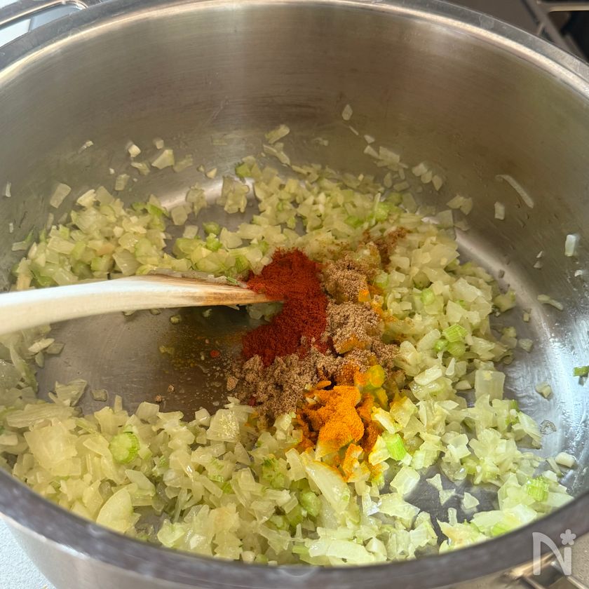 (3) 【A】のスパイスを加えて炒め、全体がなじんだらシナモンススティックを加えてさらに炒める。