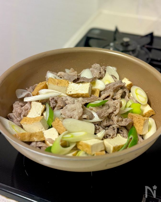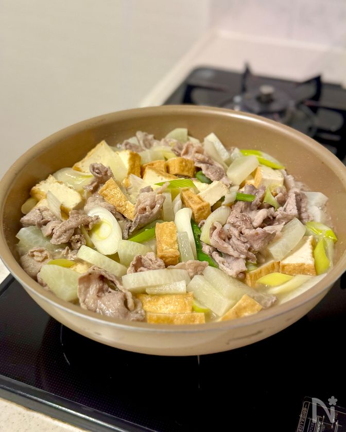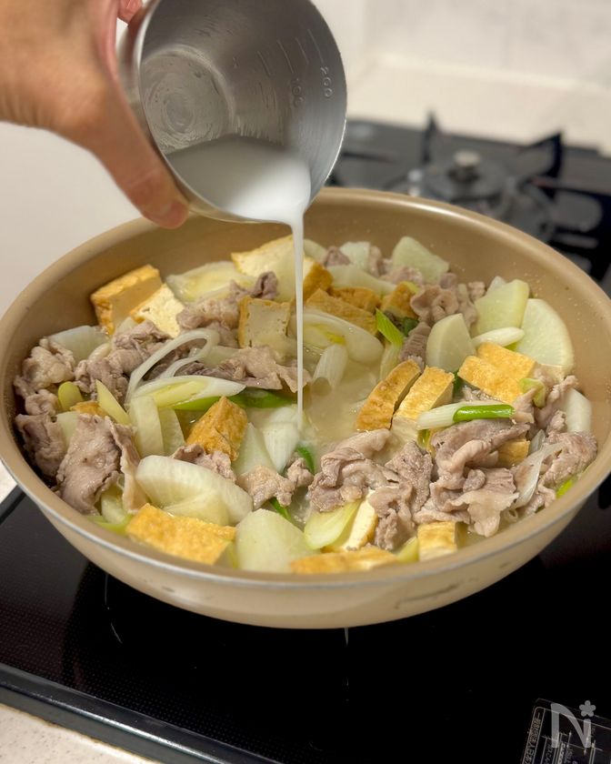 (5) レンジ加熱した大根を加え、全体をさっと混ぜる。水(200ml)を注ぎ、ひと煮立ちしたら【A】を加える。弱めの中火で1〜2分煮る。