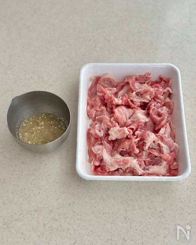 (1) 豚こま切れ肉は、大きいものがあれば食べやすい大きさに切る。塩麹(大さじ1)をもみ込み、30分〜1時間ほど置く。【A】を混ぜ合わせておく。