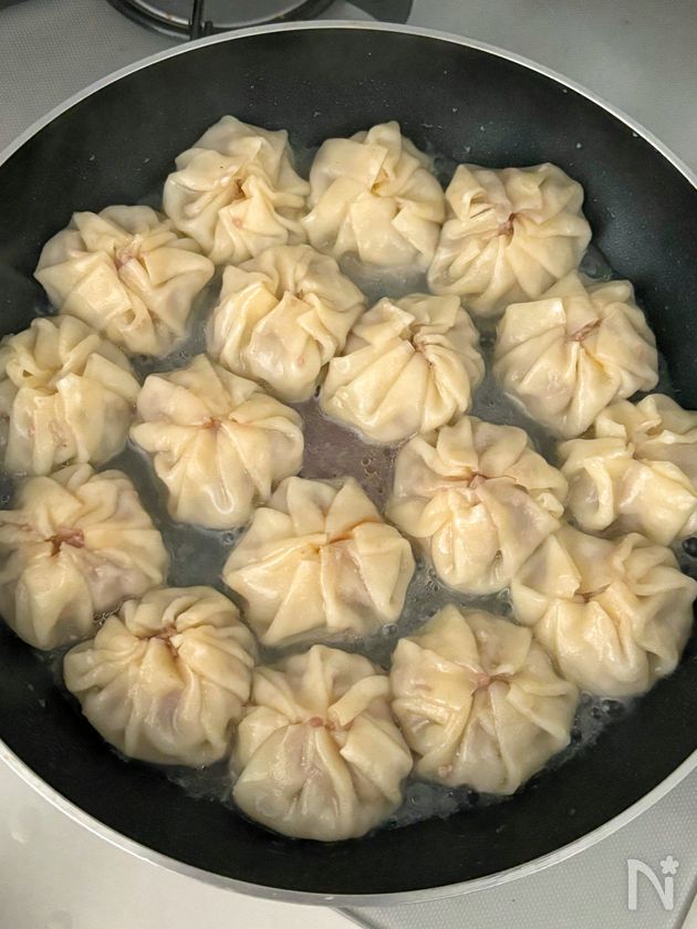 (3) 餃子の皮の真ん中に、②の肉だねをのせ、ひだを作って包み、フライパンに並べて、水1/2カップ(分量外)を入れ、フライパンの蓋をして蒸し焼きにする。