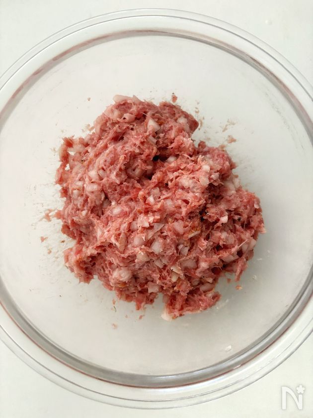 (2) ボウルに、牛豚ひき肉と、新玉ねぎと、【A】を入れ、粘りが出るまでよく混ぜ合わせて、肉だねを作る。