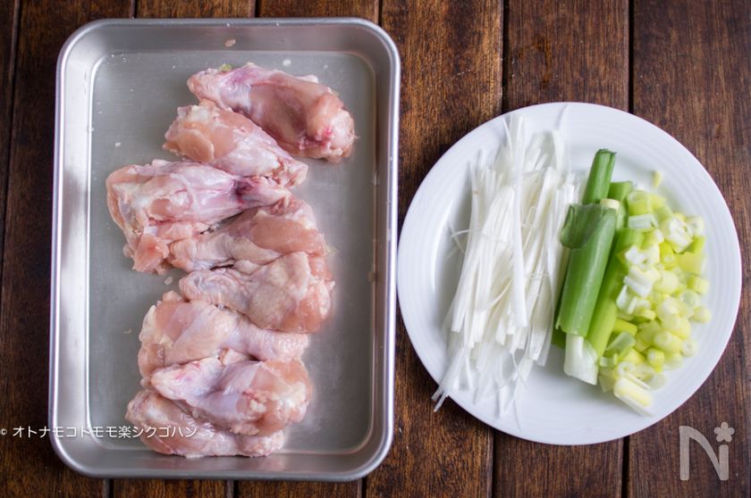 (1) 鶏手羽元に【A】をすり込みます。長ネギは白い部分は外側を千切りにし、真ん中の芯の部分は細かく切ります。青い部分は5cm程度に切ります。