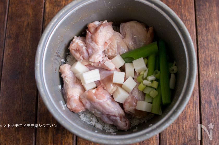 (3) 切り餅は角切りにして、鶏手羽元とネギの青い部分、【B】を炊飯器に入れて炊飯スタート。