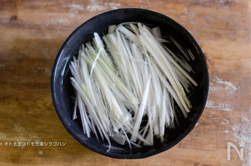 (2) 千切りにしたネギの白い部分は水にさらして辛味を抜いておきます。(白髪ねぎを作ります。)