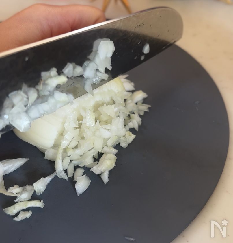 (1) むきえびは大きければ5mm〜1cm大、玉ねぎはみじん切りにする。
