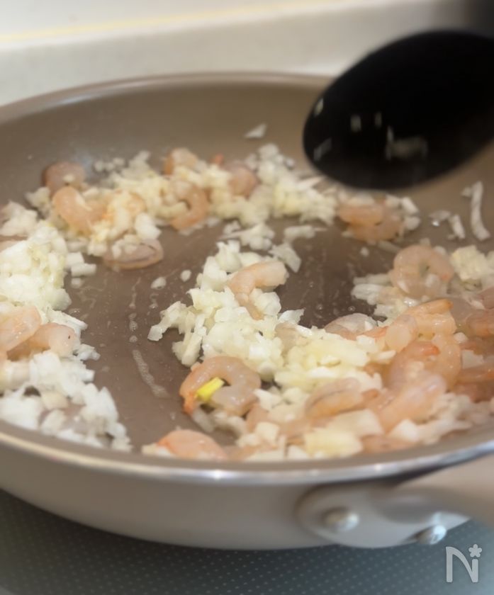 (3) フライパンに有塩バターを入れて中火で熱し、溶けてきたらむきえびと玉ねぎを炒める。