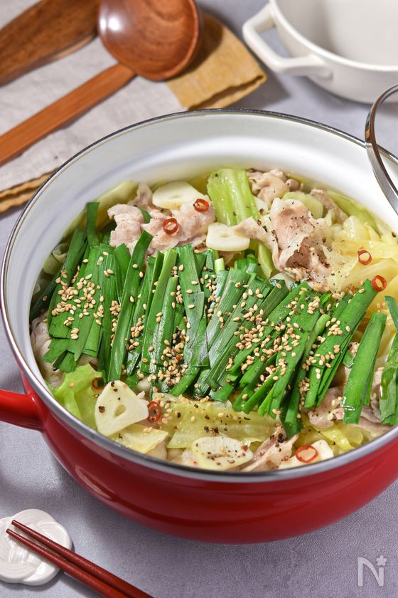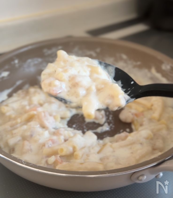 顆粒コンソメとマカロニを入れ、ぽってりとするまで混ぜながら2分ほど煮る。