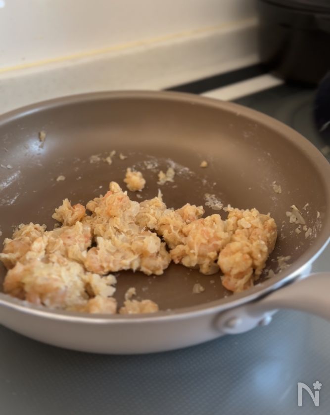 エビの他にベーコンなどの加工肉を入れても美味しく仕上がります。