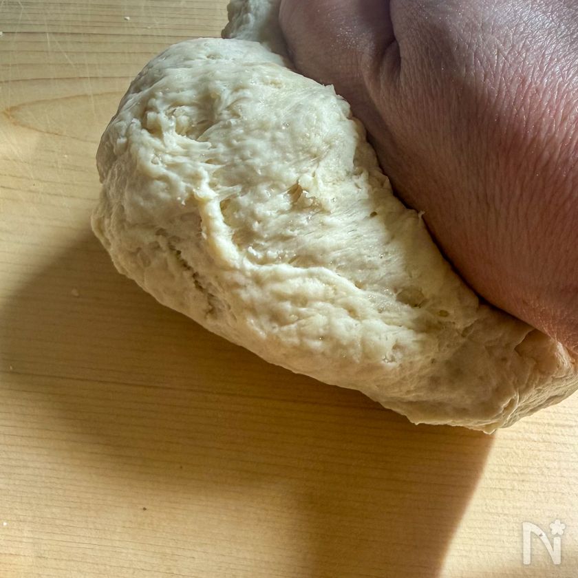 (2) 粉類がひとまとまりになったら、打ち粉用強力粉をふった台に出し、生地が伸びるようになるまで掌で数分こねる。