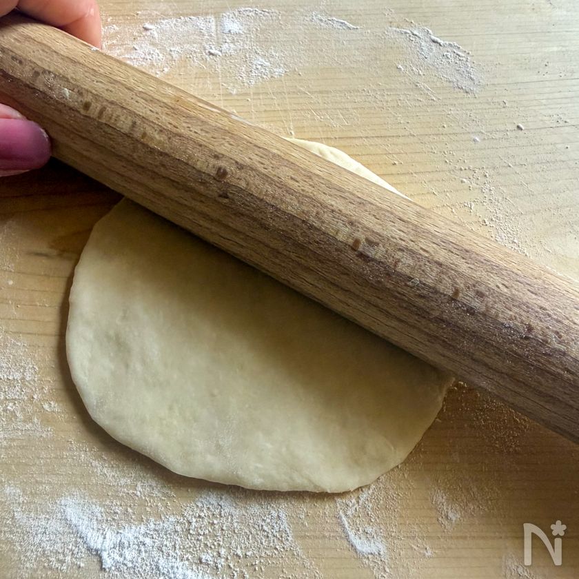 少しずつ角度を変えながら、めん棒で真ん中から外側へと広げて15cmぐらいの円にする。
