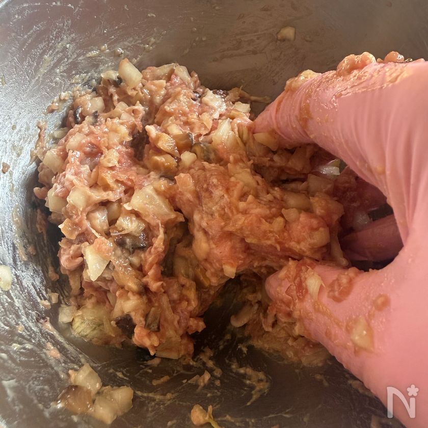 (4) ボウルに豚肉、玉ねぎ、干し椎茸、【B】の調味料を入れてよく混ぜ合わせる。