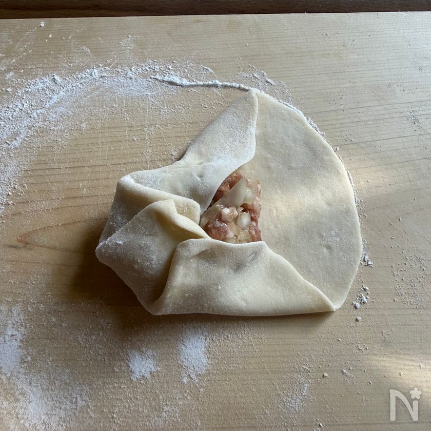 (6) 真ん中に4の肉あんをのせ、生地の端を手で少しずつ寄せて最後にしっかり閉じる。