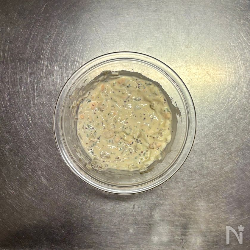 小さめのボウルに入れ、【B】、③のピクルスとパセリを加えて混ぜる。