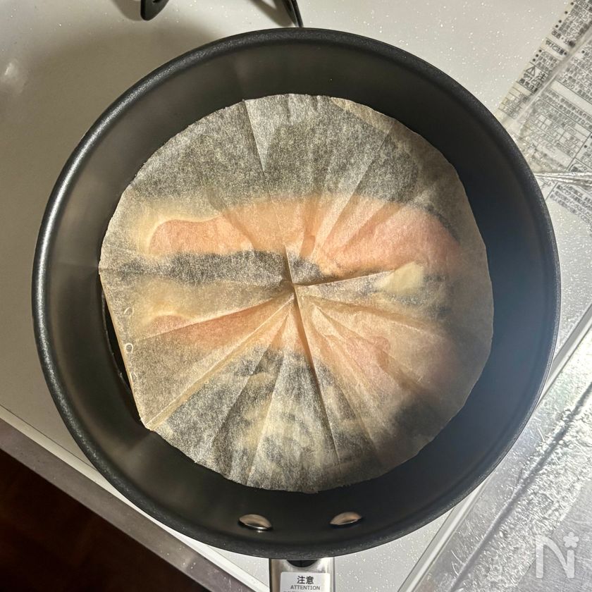 沸騰したらごく弱火にし、②の塩ざけを入れ、オーブンペーパーで落としぶたをし、5分ほどゆでて火を通す。
