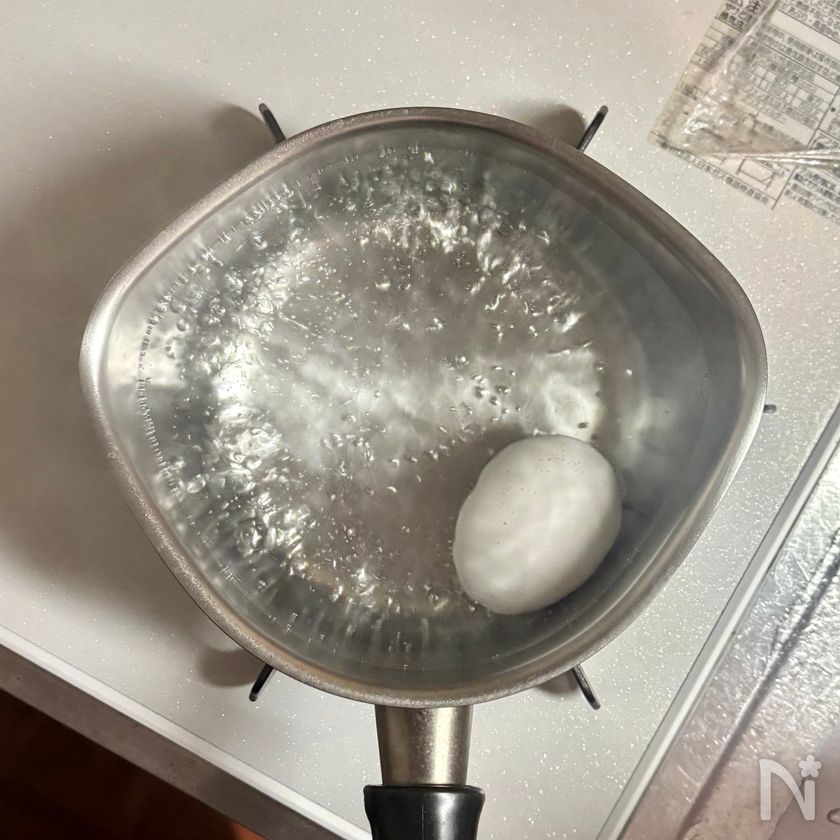 (1) 小鍋に湯を沸かし、冷蔵庫から出した卵をそっと入れ、再び沸騰したら弱めの中火で12分ゆでる。
