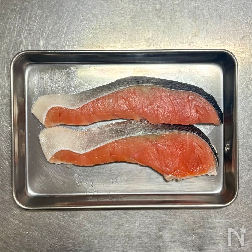 (2) 塩ざけは室温に7分ほどおき、出てきた水気をペーパータオルで拭く。
