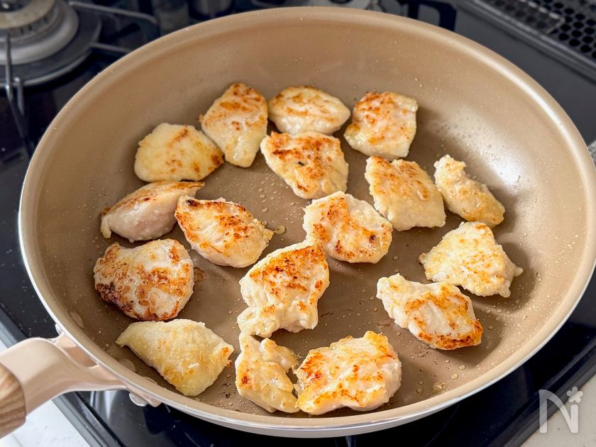 (2) ささみに片栗粉をまぶし、オリーブ油を中火で熱したフライパンに並べる。底面に焼き色がつくまで約3分焼いたら上下を返し、蓋をして3分焼き、一旦取り出す。