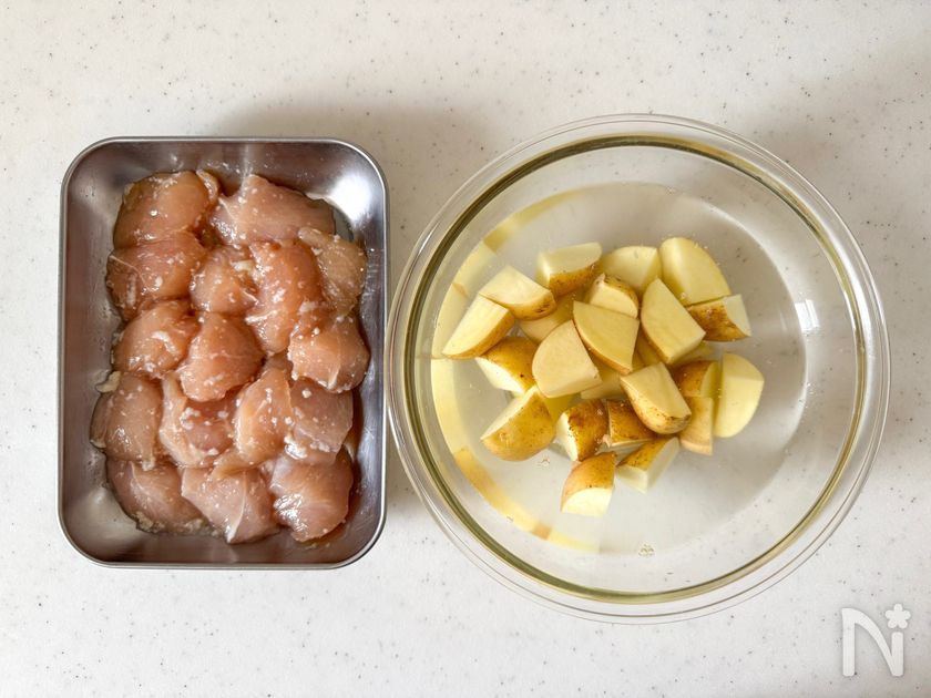 (1) ささみはひとくち大のそぎ切りにして塩麹をまぶし、30分置く。新じゃがいもはよく洗って皮がついたまま1個を8等分に切って浸水する。
