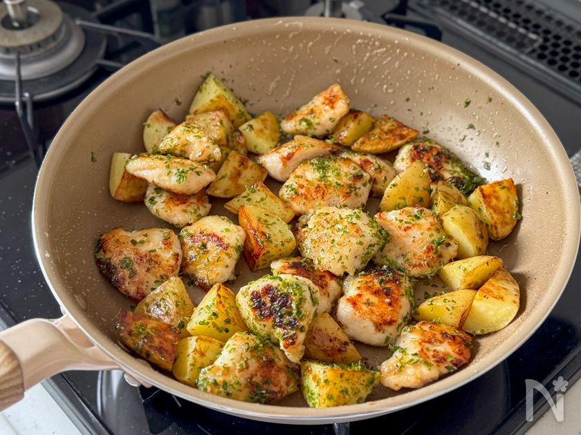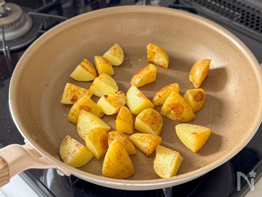 (3) じゃがいもは水気を切って耐熱容器に移し、600Wの電子レンジで5分加熱する。2のフライパンに入れ、オリーブ油を継ぎ足し、カリッとするまで4分ほどかけて焼く。