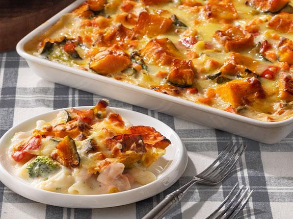 寒い季節にぴったり。ダイスカットしたサーモンとごろっとしたカボチャやブロッコリー、ペンネをたっぷりのホワイトソースでクリーミーに焼き上げたグラタンです。