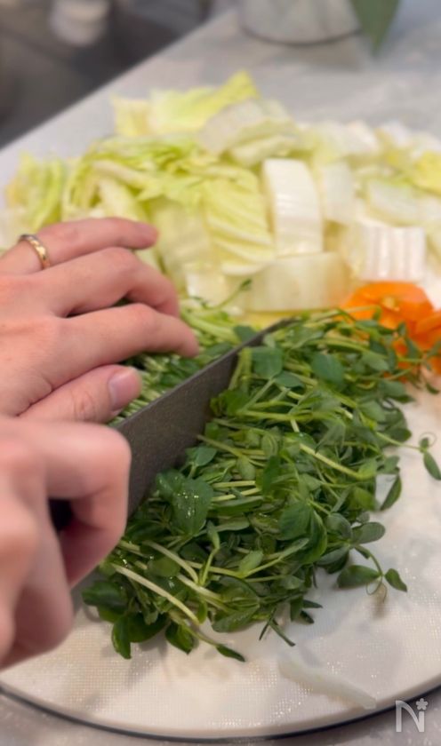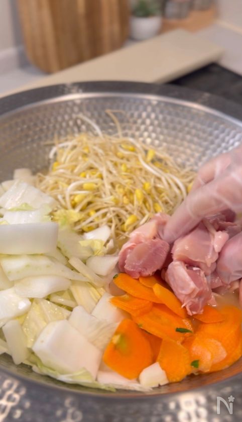 (3) ②の鍋に鶏もも肉・もやし・人参・白菜を入れて蓋をして中火で煮る。