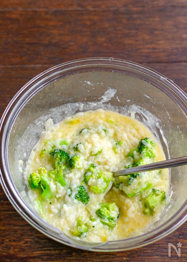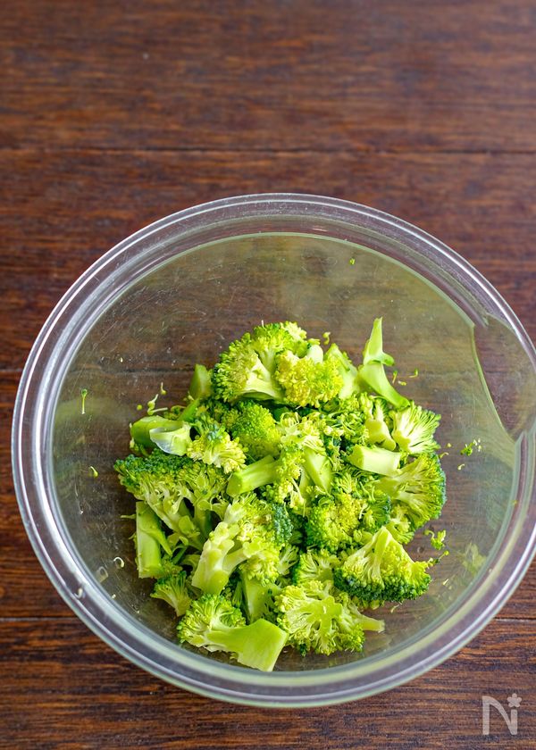 (3) 2を電子レンジから取り出し、シュレッドチーズ、ブロッコリーを加える。