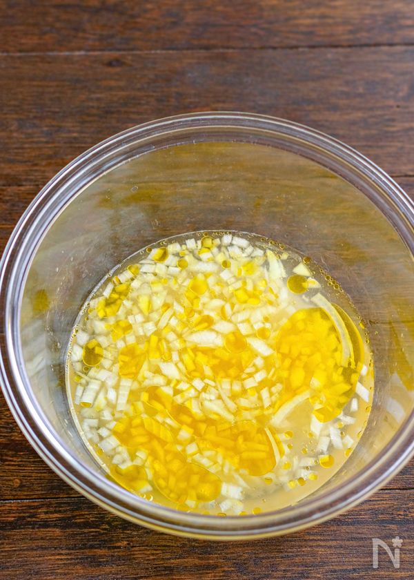 (2) 大きめの耐熱ボウルに米、【A】を入れて混ぜ合わせる。玉ねぎ(みじん切り)をのせてラップをかけ、電子レンジ(600W)で8分加熱する。