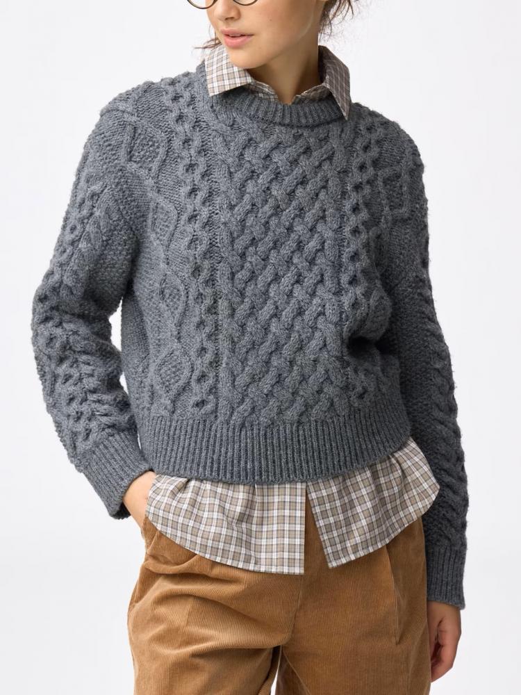 冬の王道アイテムと言えば、ケーブルニット。複数のケーブル柄を組み合わせた立体的なデザインと着膨れしない絶妙なサイズ感が特徴。シンプルな中にこだわりが詰まった、大人のための主役級トップスです。