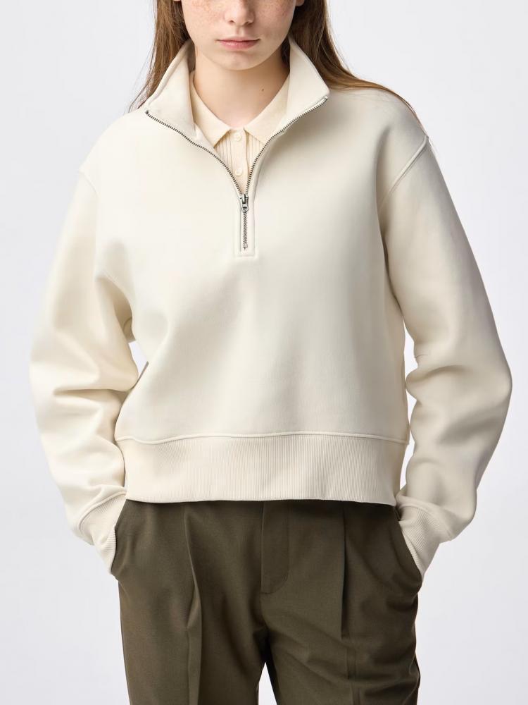 裏起毛に肉厚な生地感、保温機能まで付いた、寒がりさん必見のトップス。ハリのある上質な雰囲気とラフな着心地を両立した、スウェットの価値観が変わる一着です。中にシャツやTシャツを合わせ、ジップを深めに下げるだけで、上級者コーデが完成します。