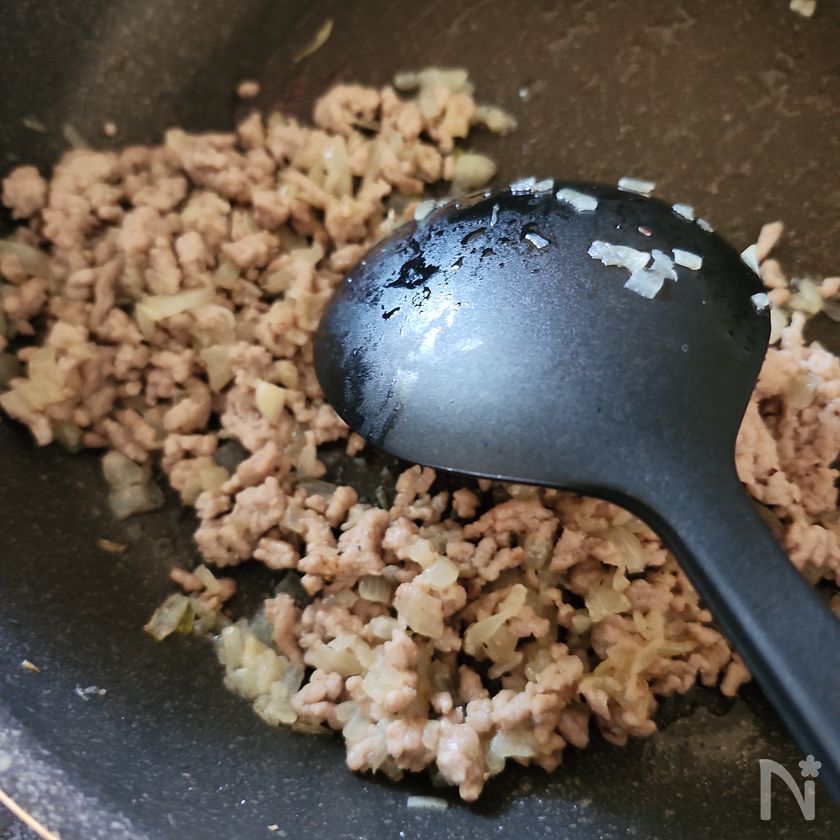 (2) フライパンに油を熱し、玉ねぎを炒める。玉ねぎが透き通ってきたら豚ひき肉も加え、炒める。酒を加えてひき肉に火が通ったら【A】を加え味をととのえる。