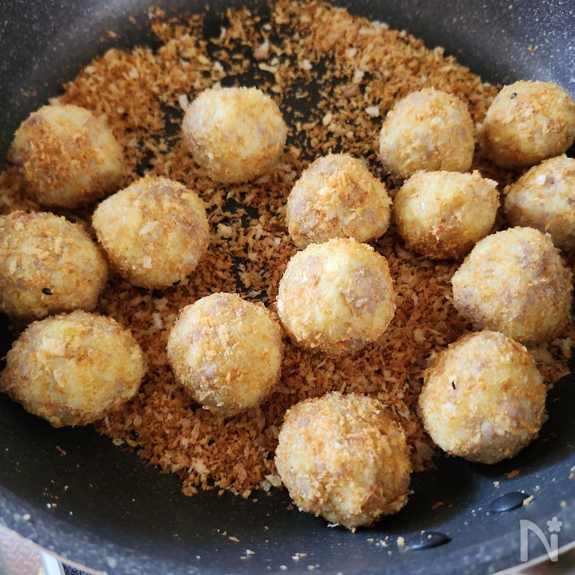 (4) フライパンに1のパン粉を戻す。コロッケを転がして、まんべんなくパン粉を付ける。