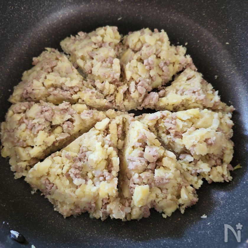 (3) つぶしたさつまいもを加え、フライパンの中で混ぜて円形にまとめる。