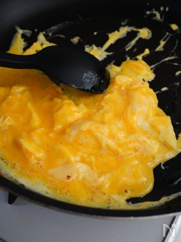 (1) フライパンにサラダ油(適量)をひき、中火〜強火にかけて熱する。十分温まったら溶き卵を一気に流し入れ、スクランブルエッグを作る様に箸で混ぜながら炒める。卵が半熟ふわふわになったら火を止め、ボウルに移す。